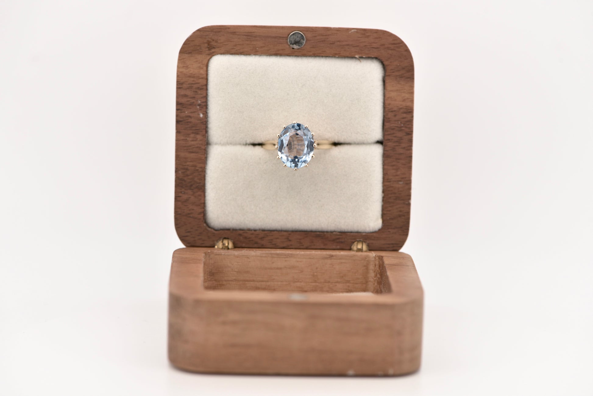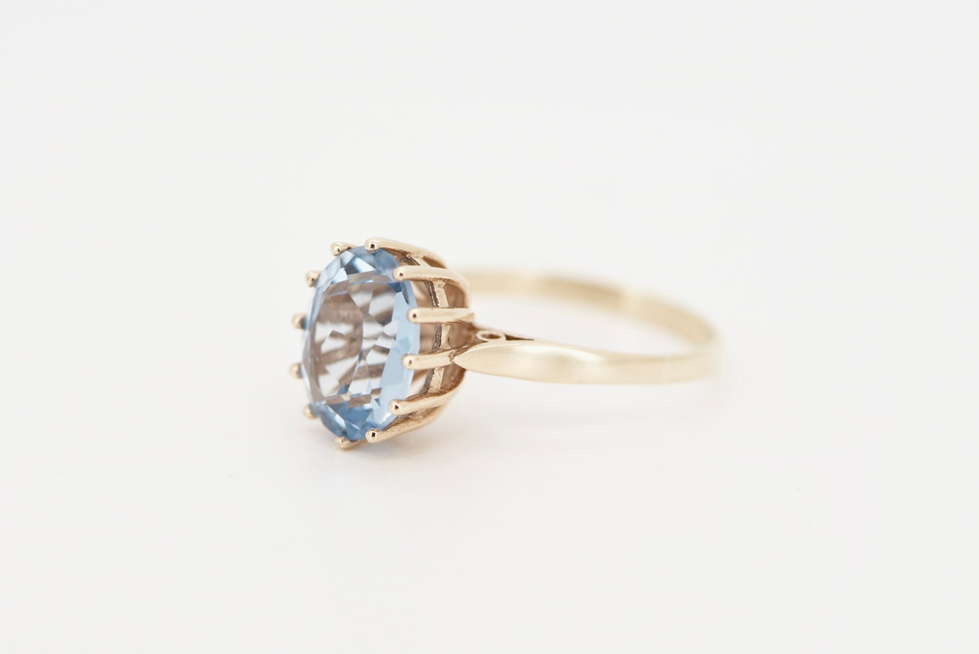 A gorgeous basket set blue stone, probably Topaz, in 9ct yellow gold. Such a classic retro style in fabulous condition, ready to wear. Everyone needs a good cocktail ring in their collection!