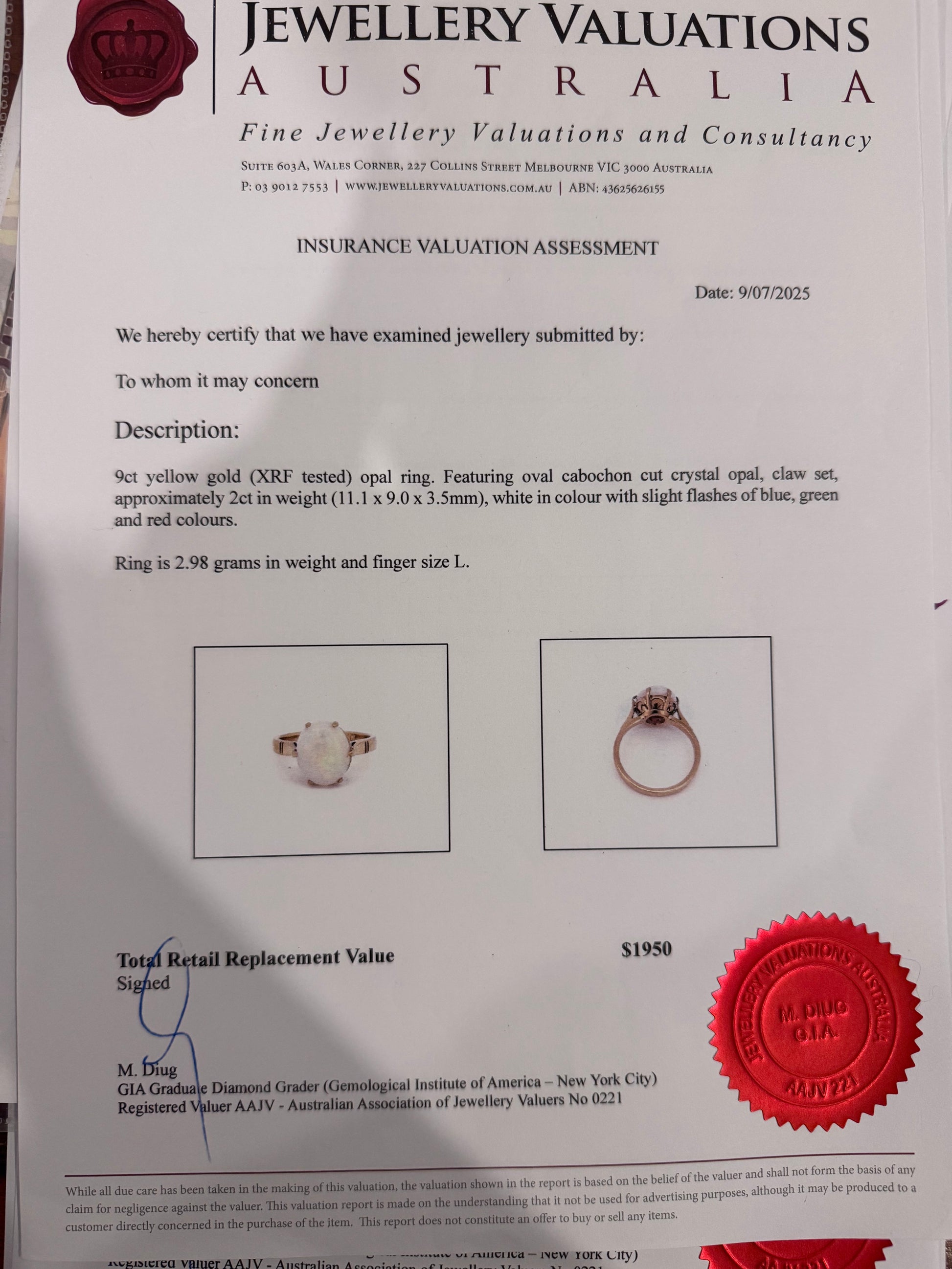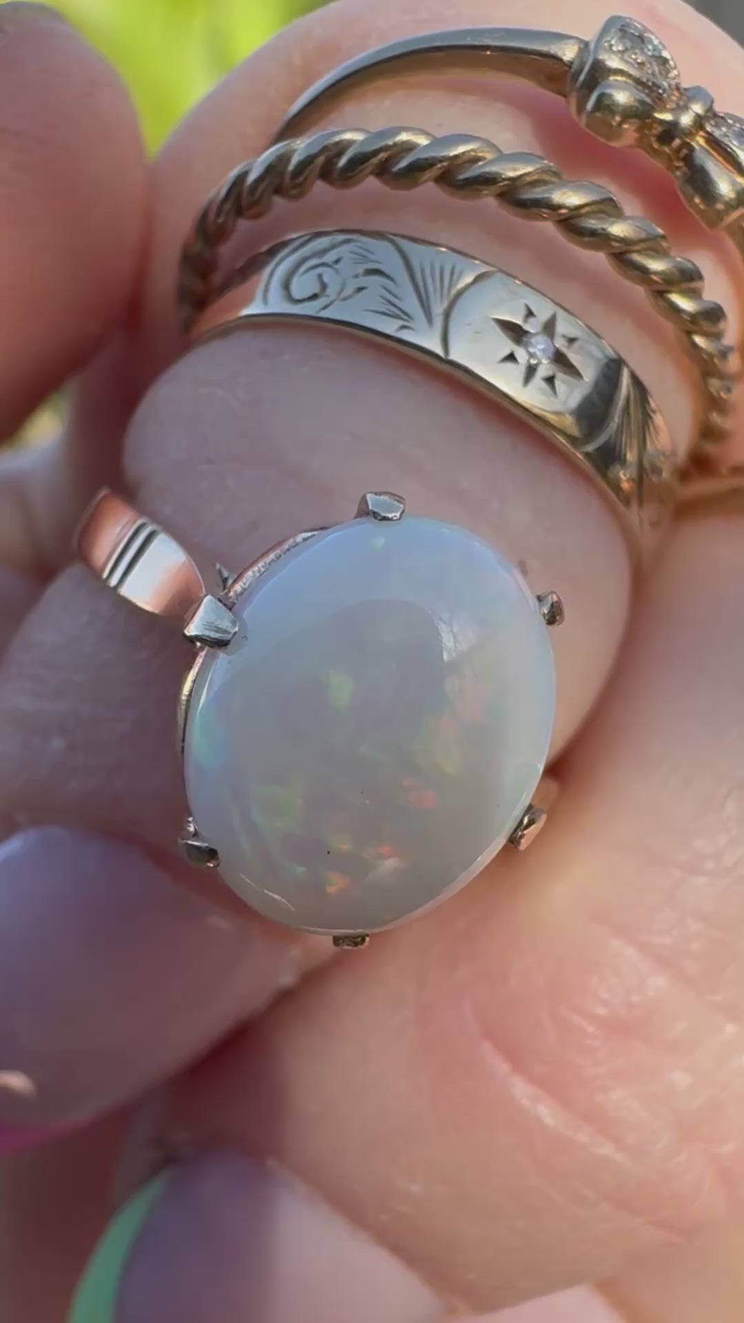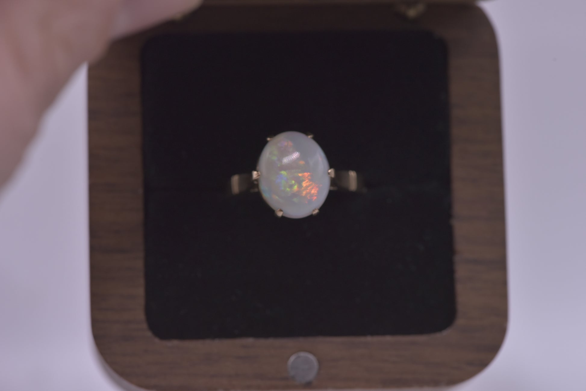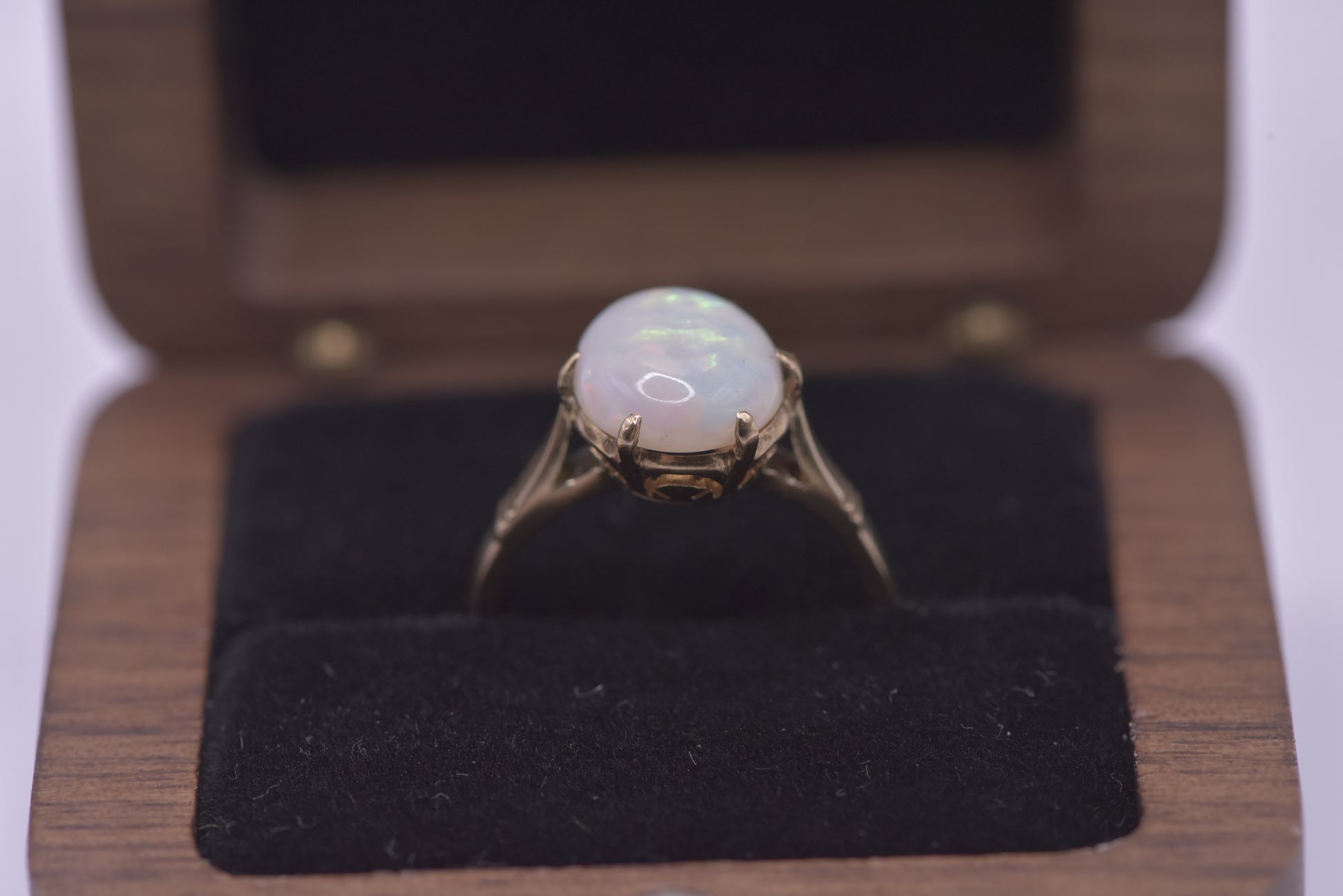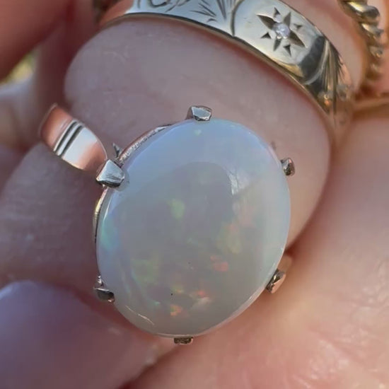 Absoutely stunning 9ct gold opal ring. This solid 2ct White Australian Opal has beautiful flashes of green, yellow and red. Set in a lovely vintage 6 claw basket setting
