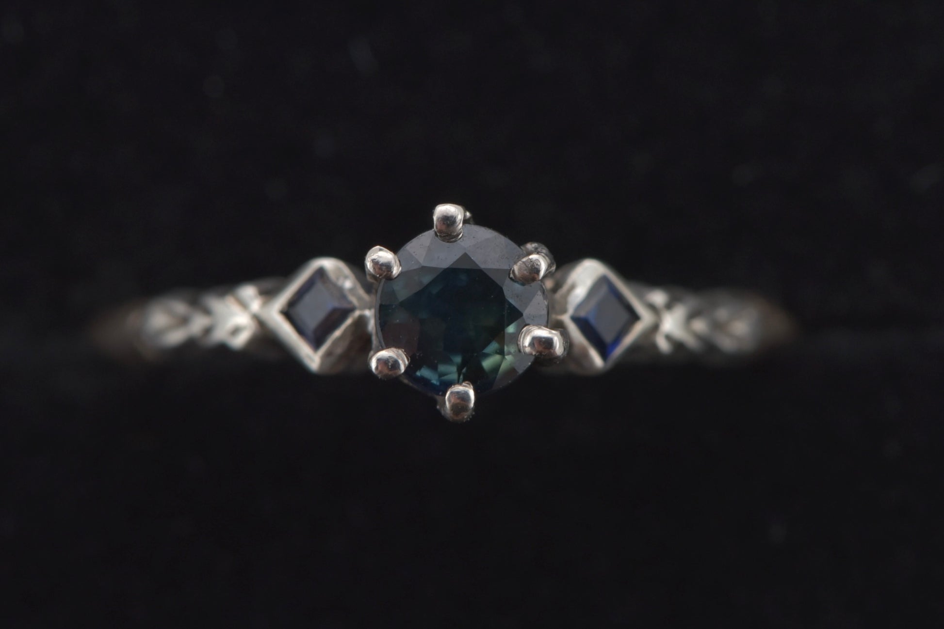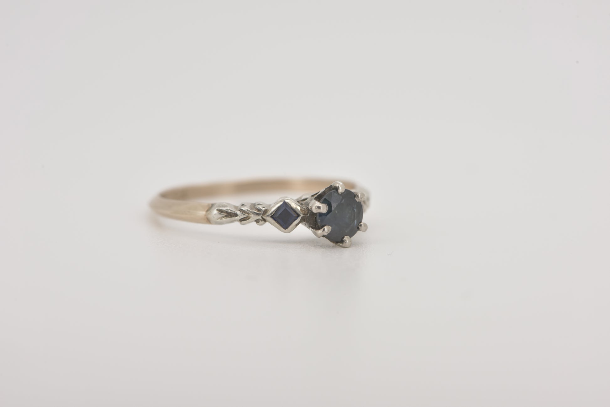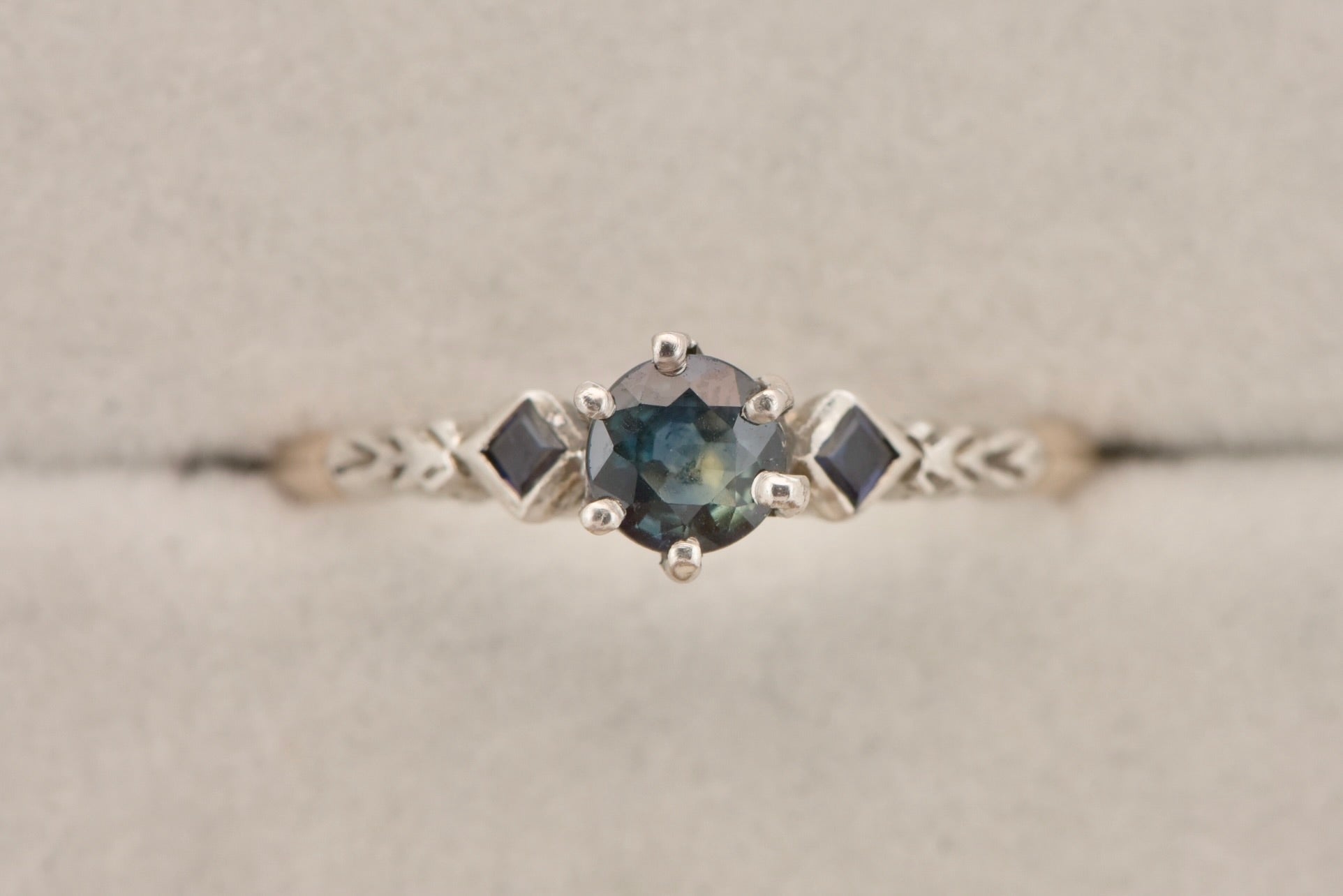 A gorgeous old setting with a decent size 0.45 ct Australian parti sapphire set in 8ct yellow and white gold with two square cut sapphires on the shoulders and gorgeous etched detail.
