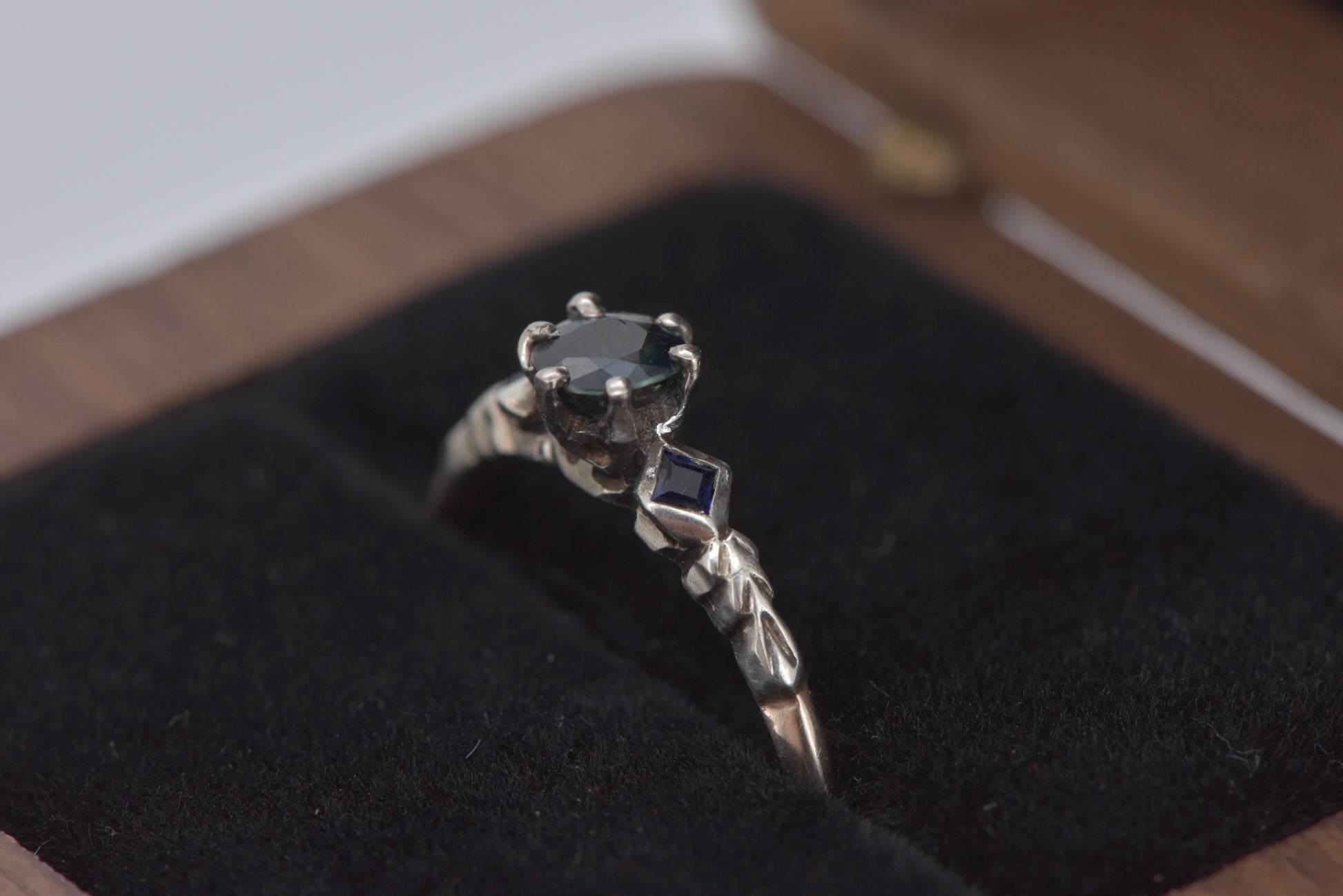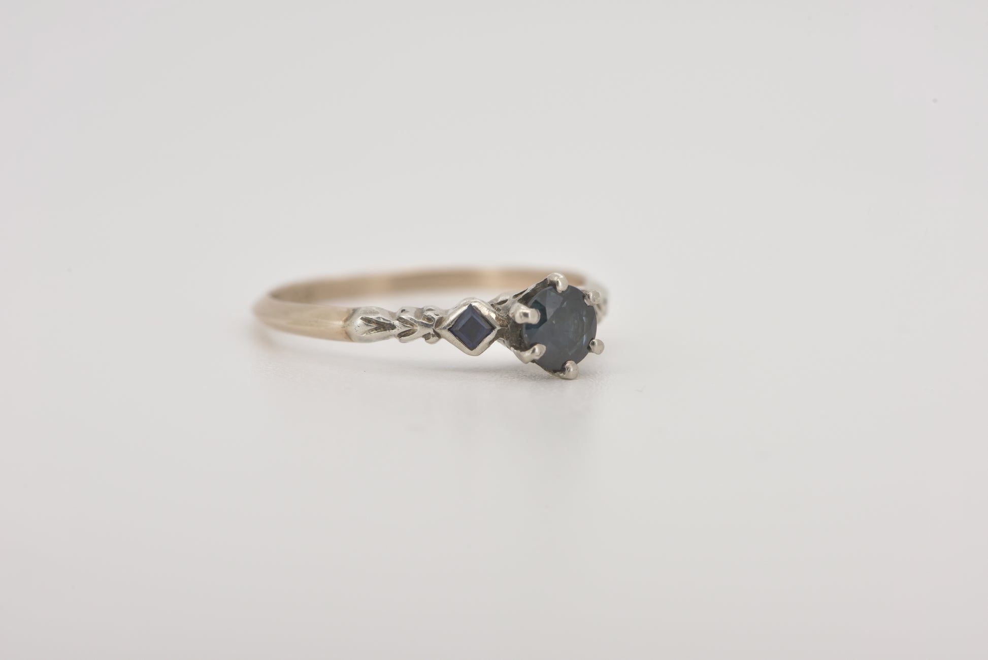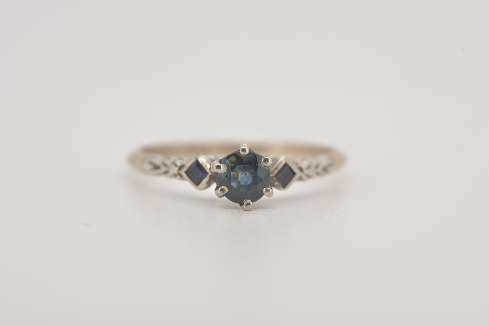 A gorgeous old setting with a decent size 0.45 ct Australian parti sapphire set in 8ct yellow and white gold with two square cut sapphires on the shoulders and gorgeous etched detail.
