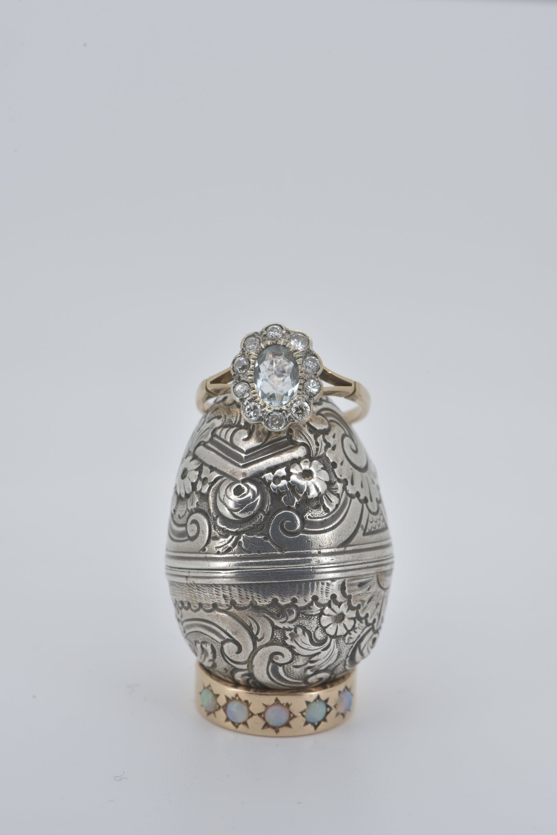 An absolutely stunning handmade piece with a natural Aquamarine surrounded by 10 old cut diamonds. Her split shoulders so elegantly compliment the style which tapers to a comfortable wearable band.