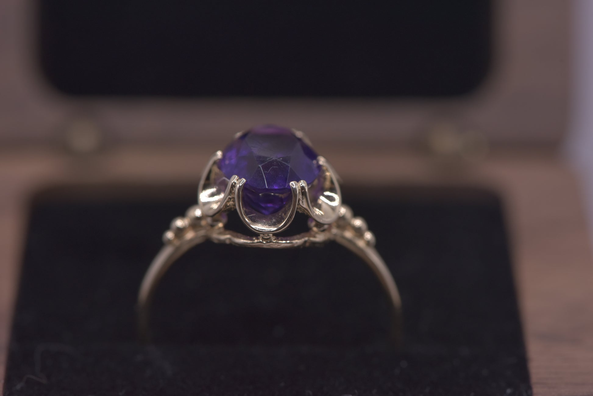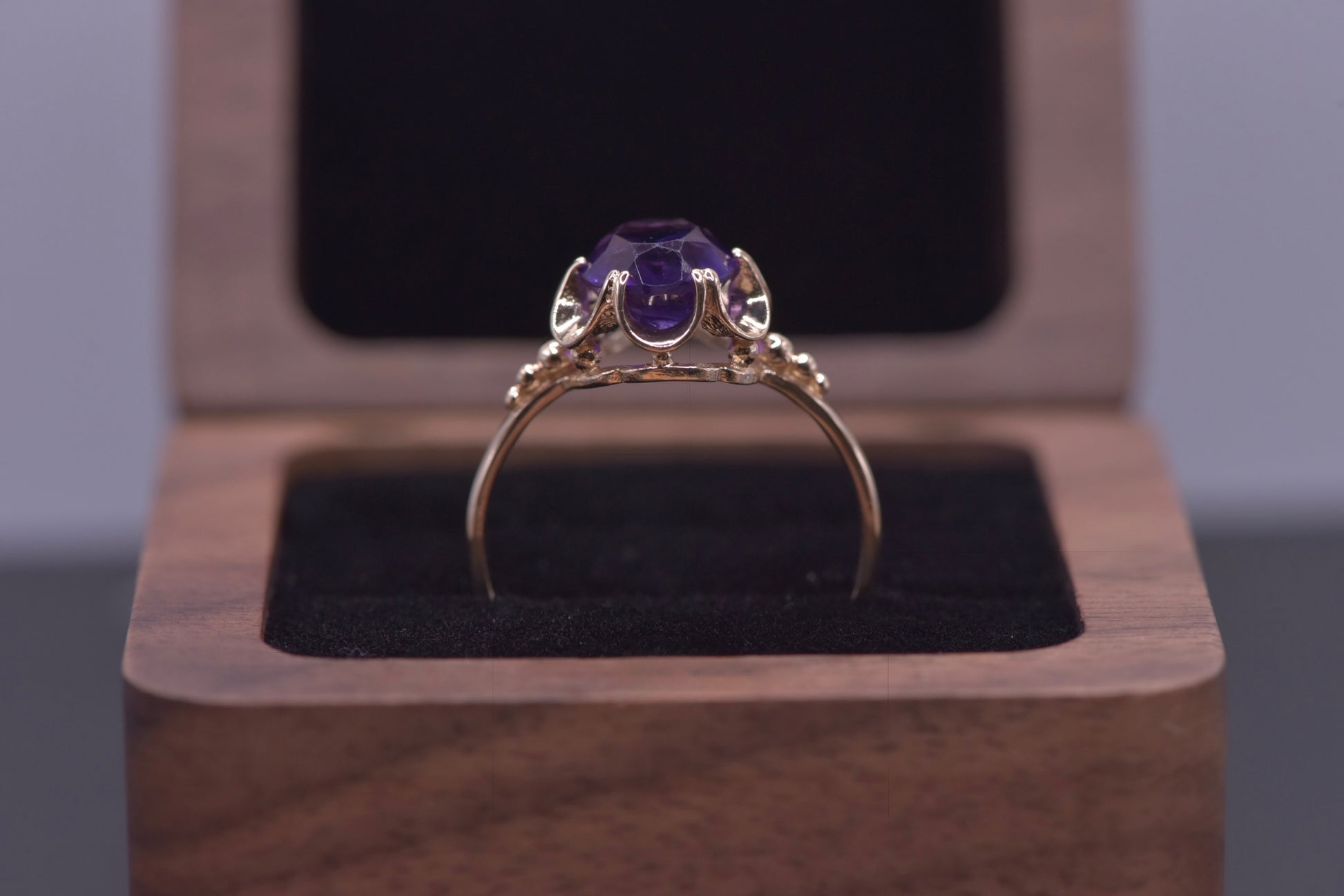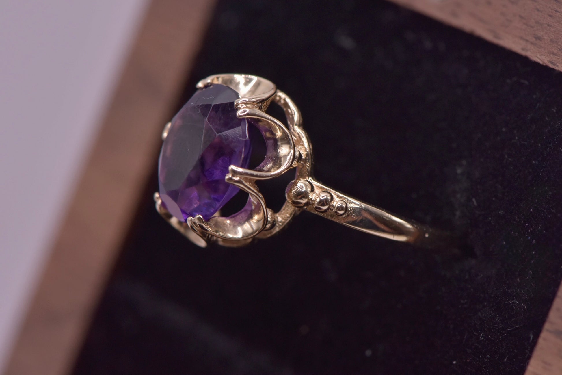 9ct Amethyst in a lovely retro buttercup setting with beaded detailing on the shoulders for added interest.