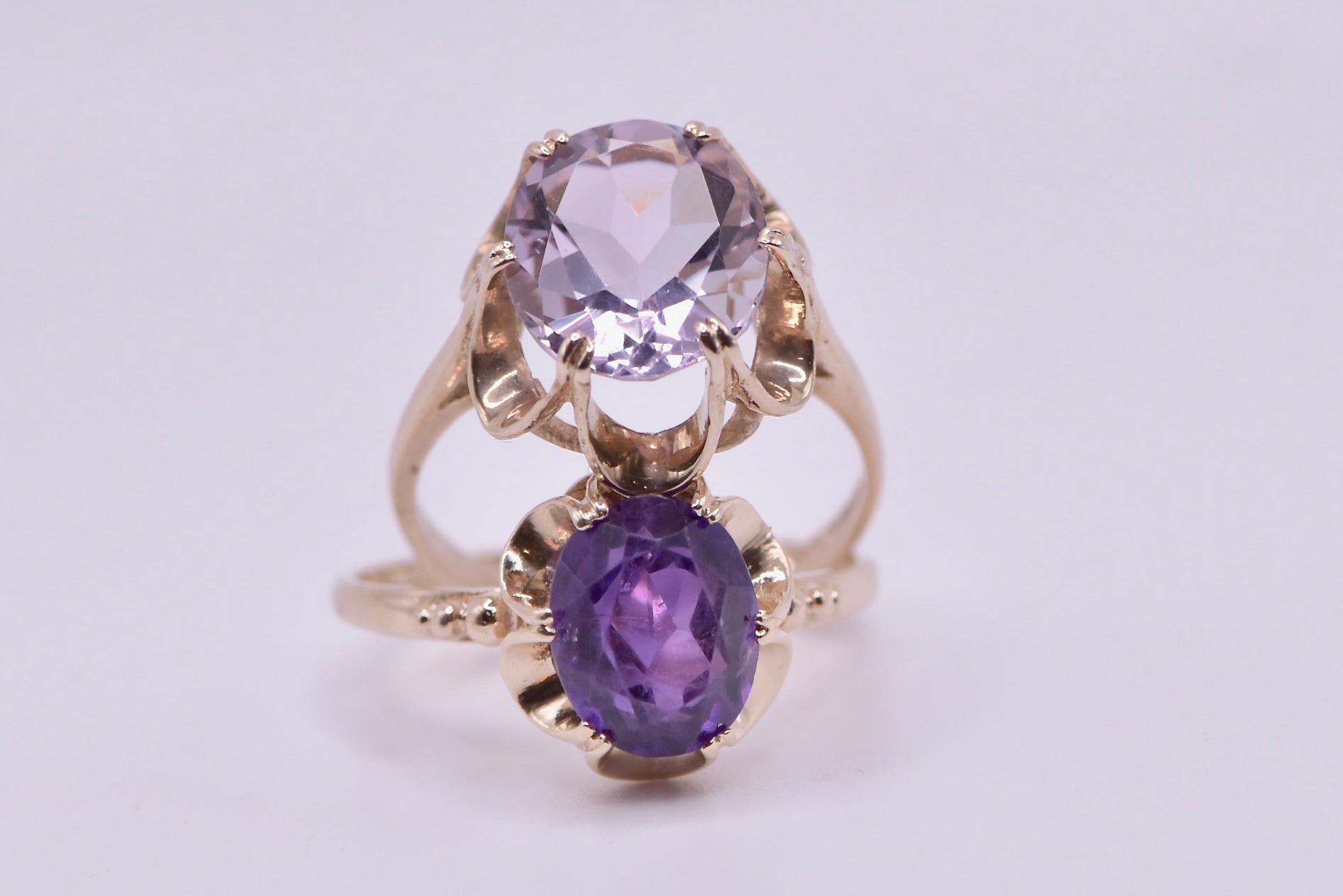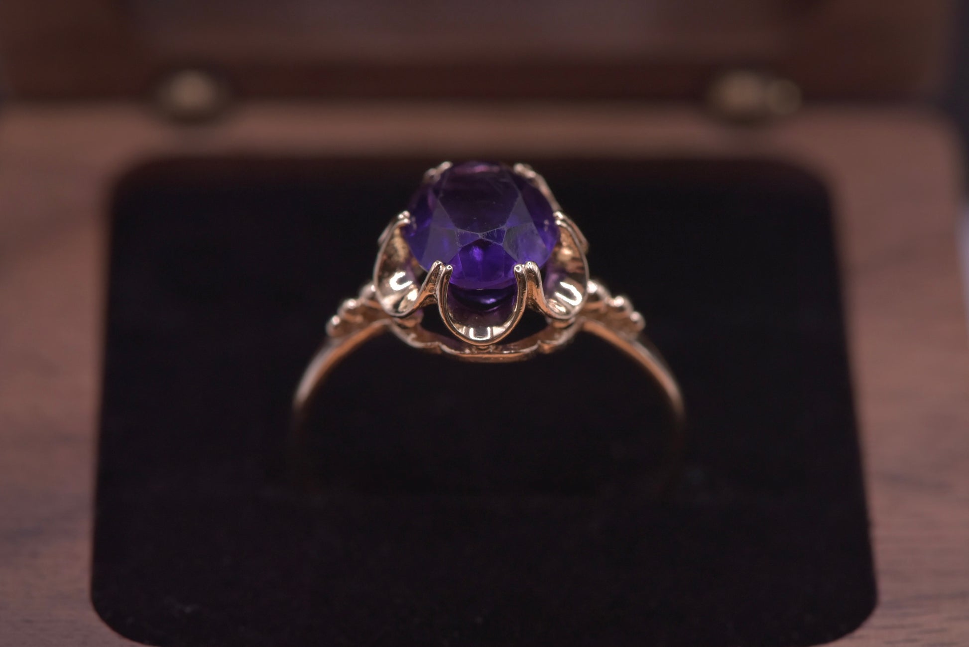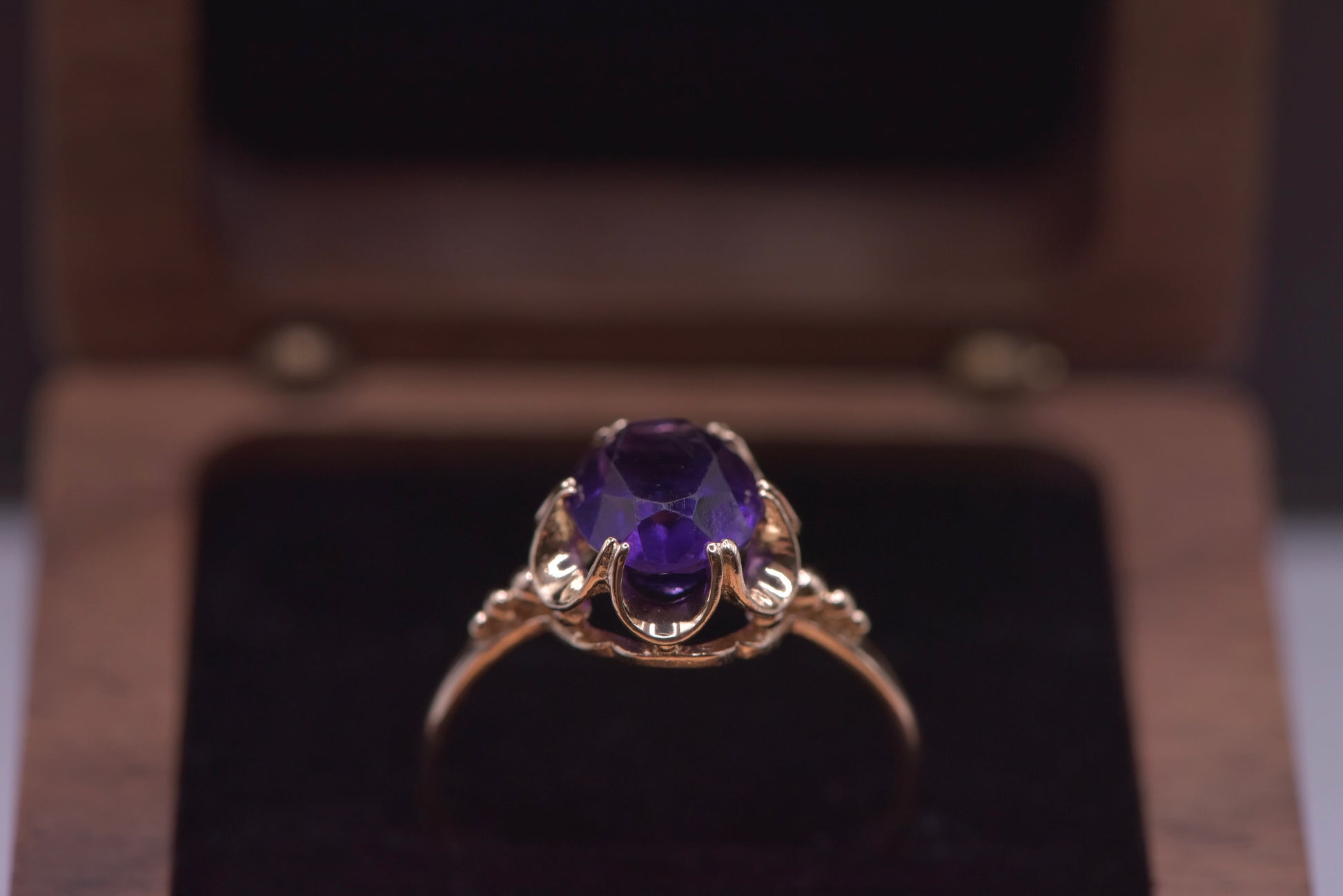 9ct Amethyst in a lovely retro buttercup setting with beaded detailing on the shoulders for added interest.