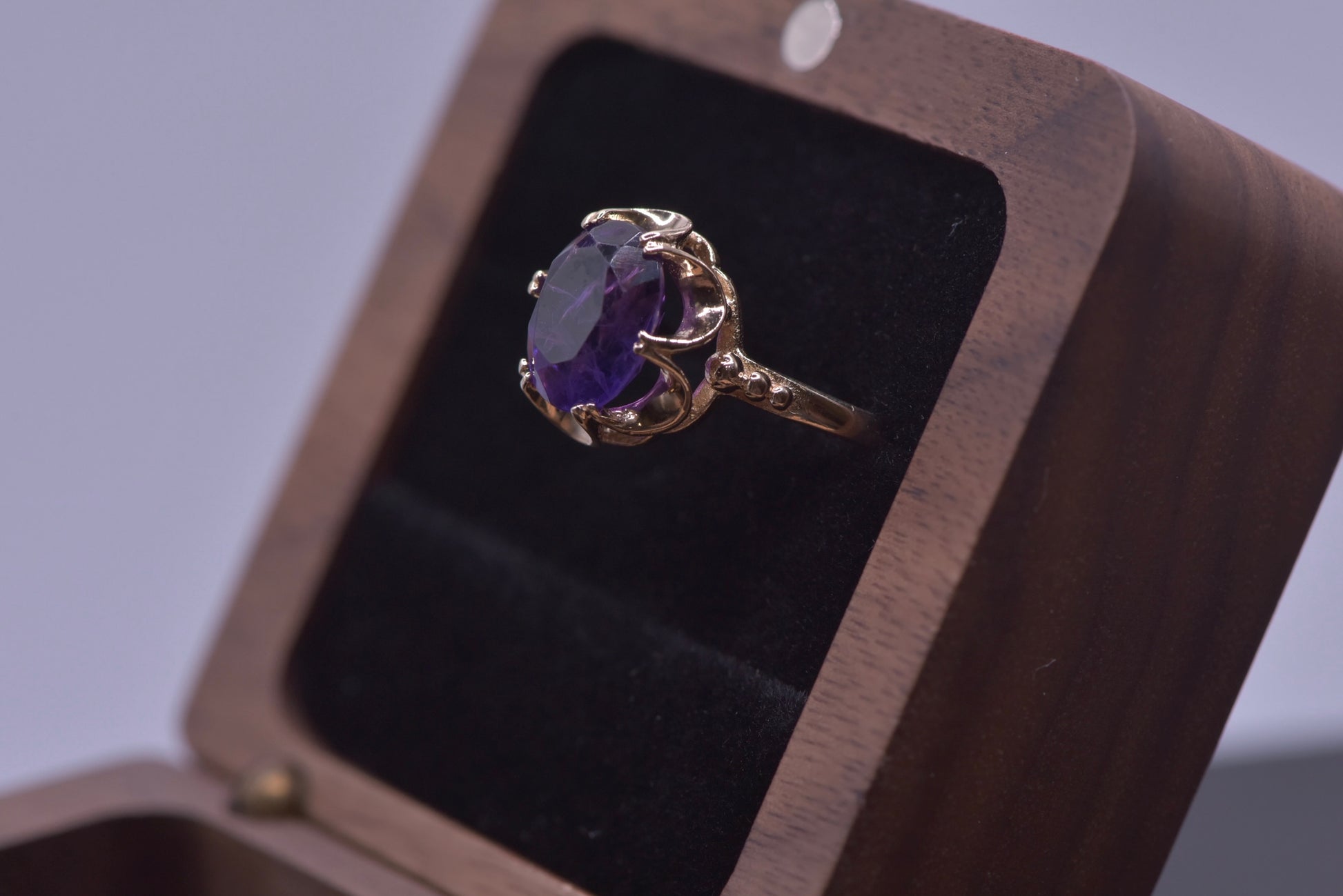The stone is a lovely dark Amethyst in great condition and a decent size approximately 10mm x 7mm.