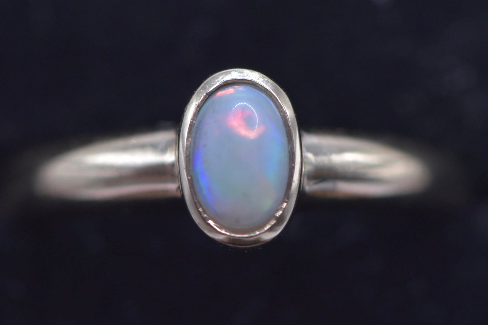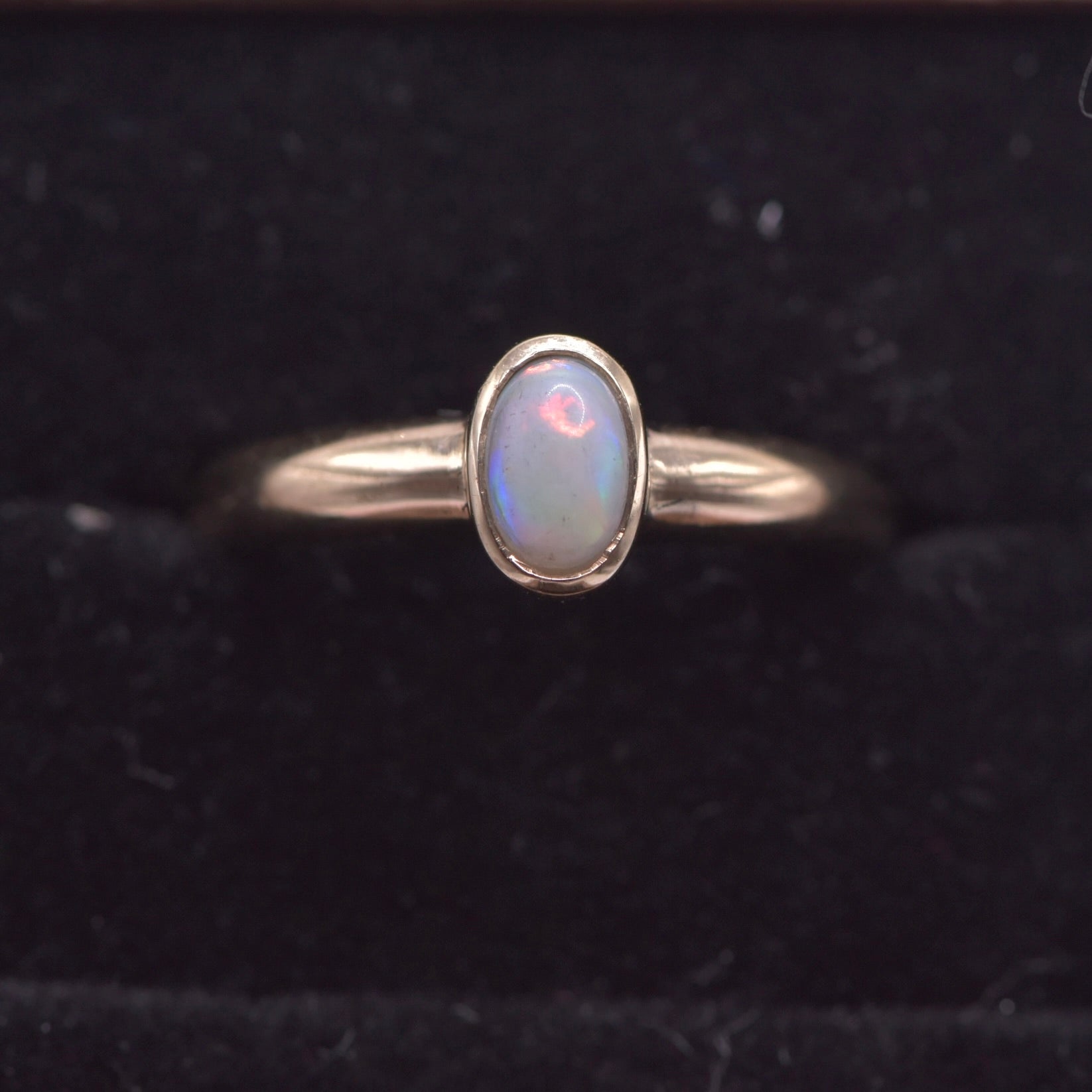Sweet solid opal ring in 9 ct yellow gold. A really pretty ring with a classic bezel setting and slightly domed band.