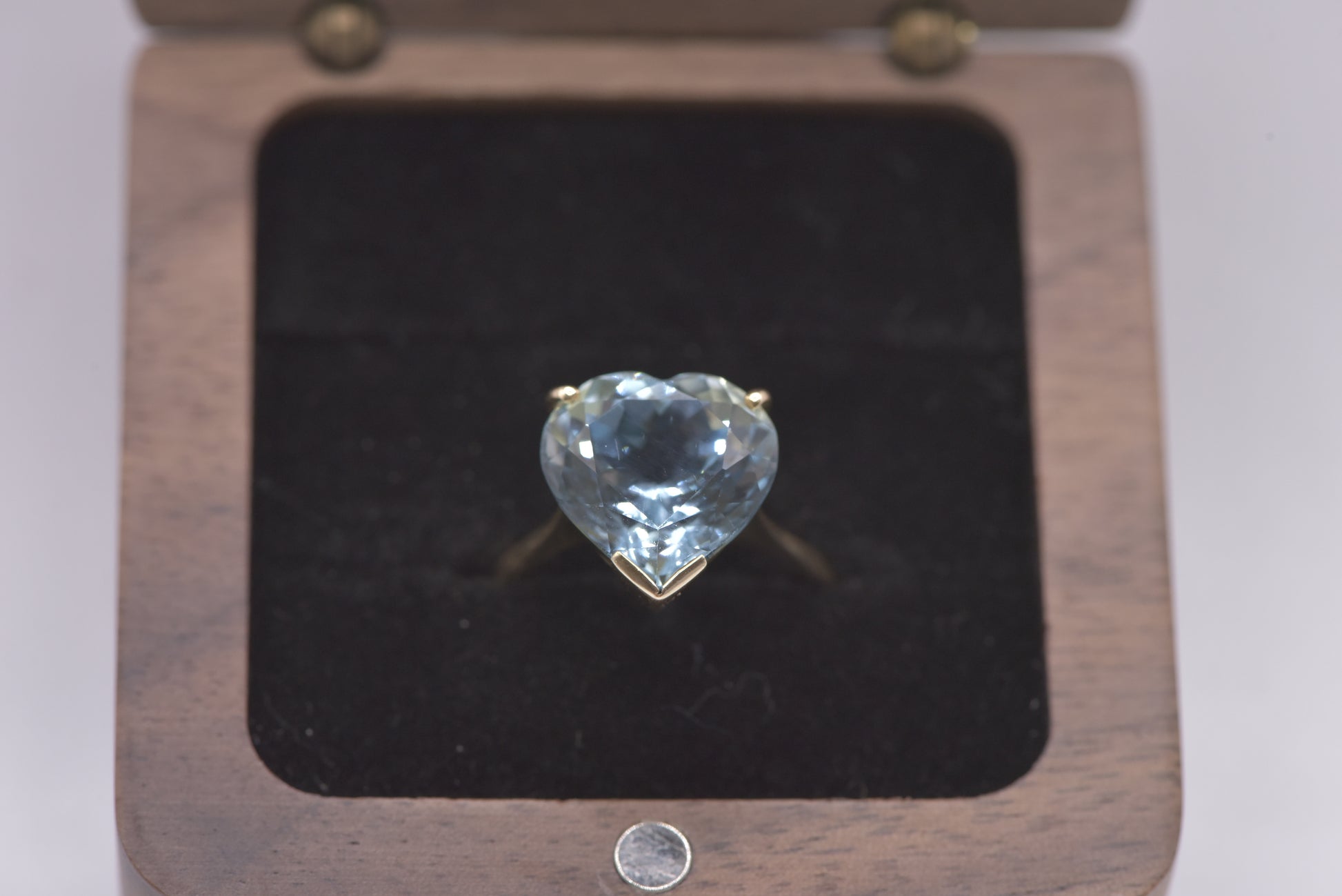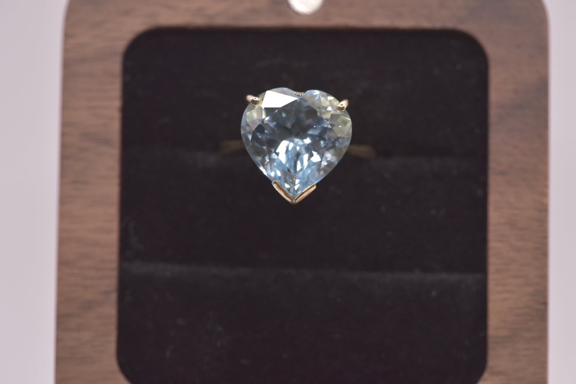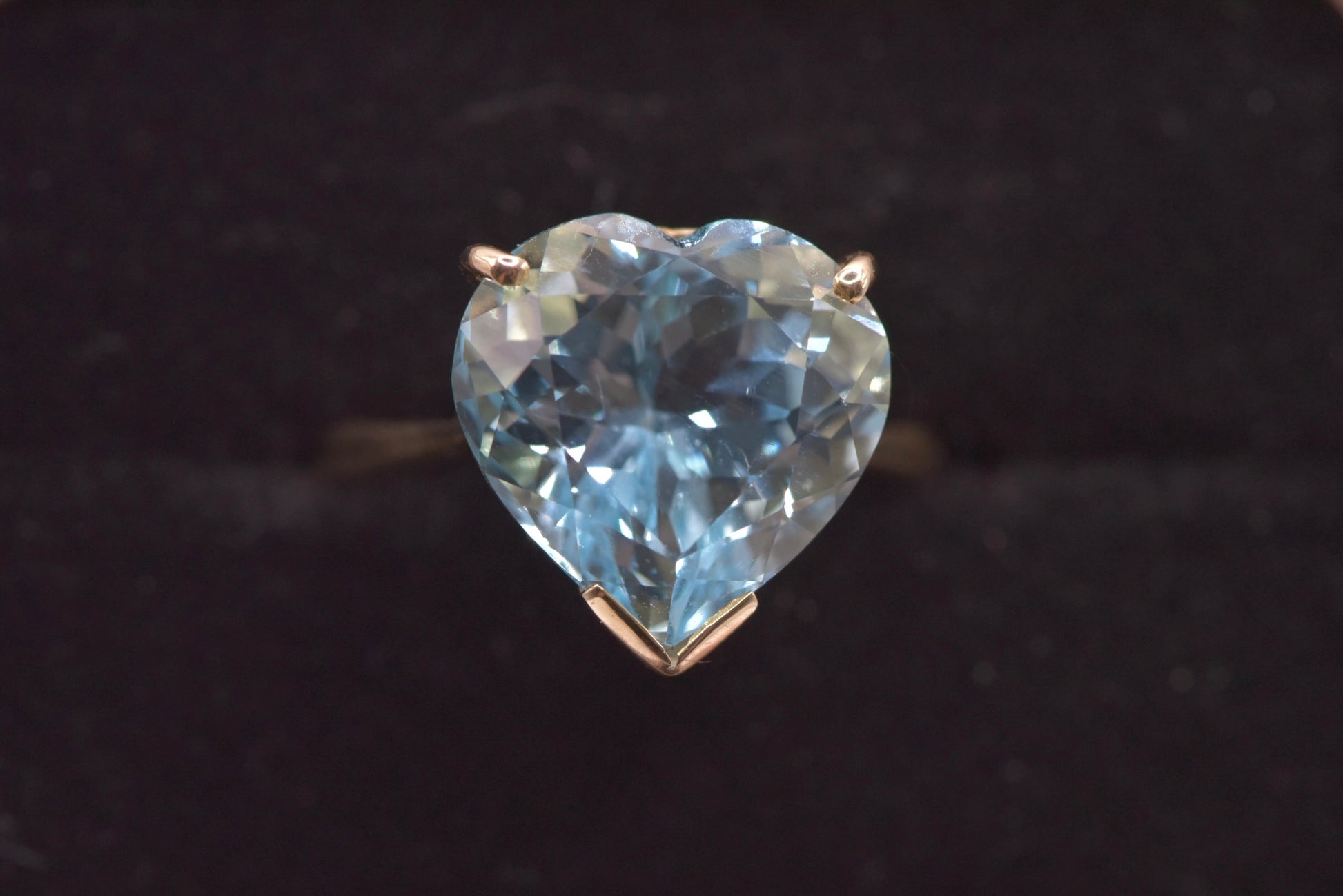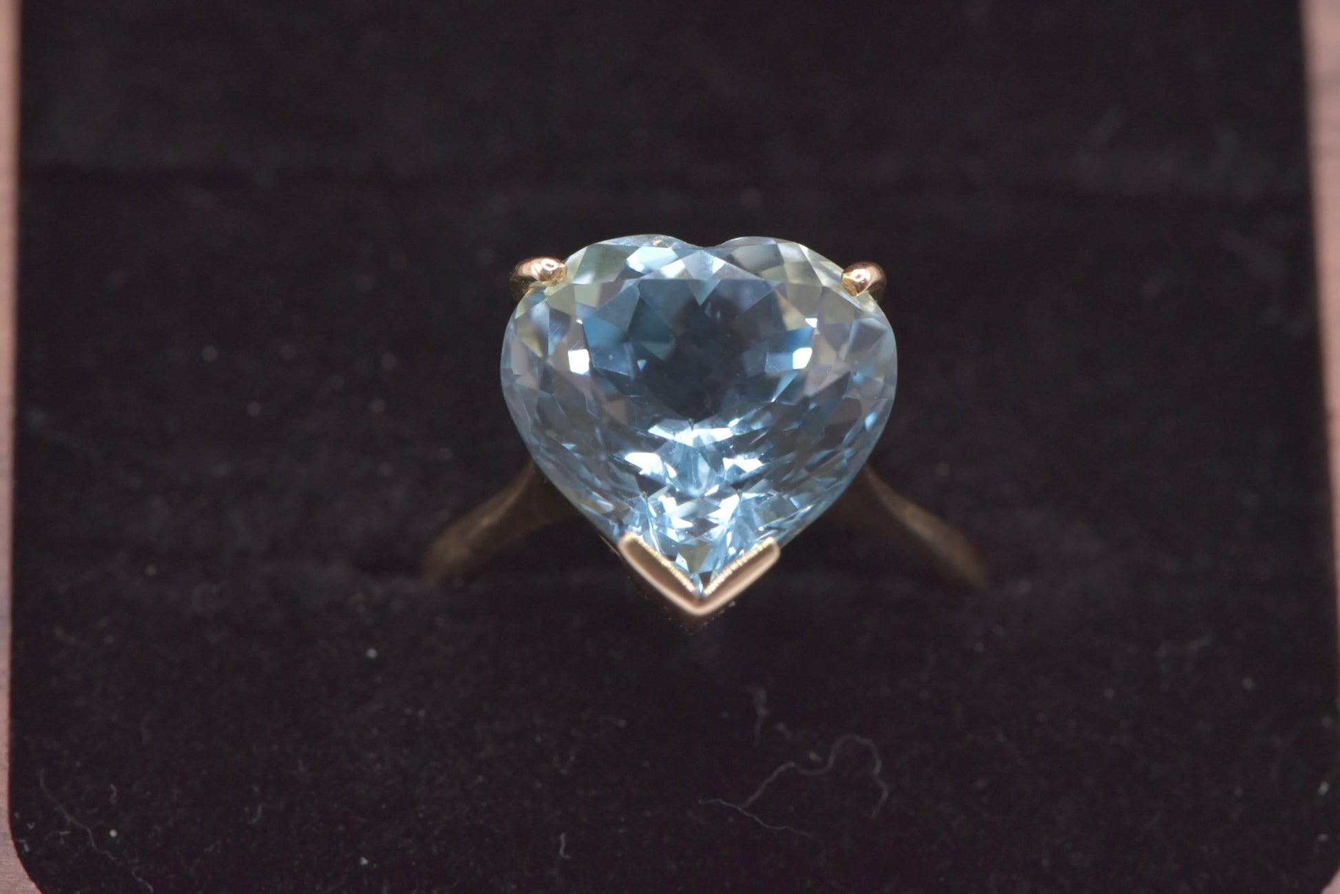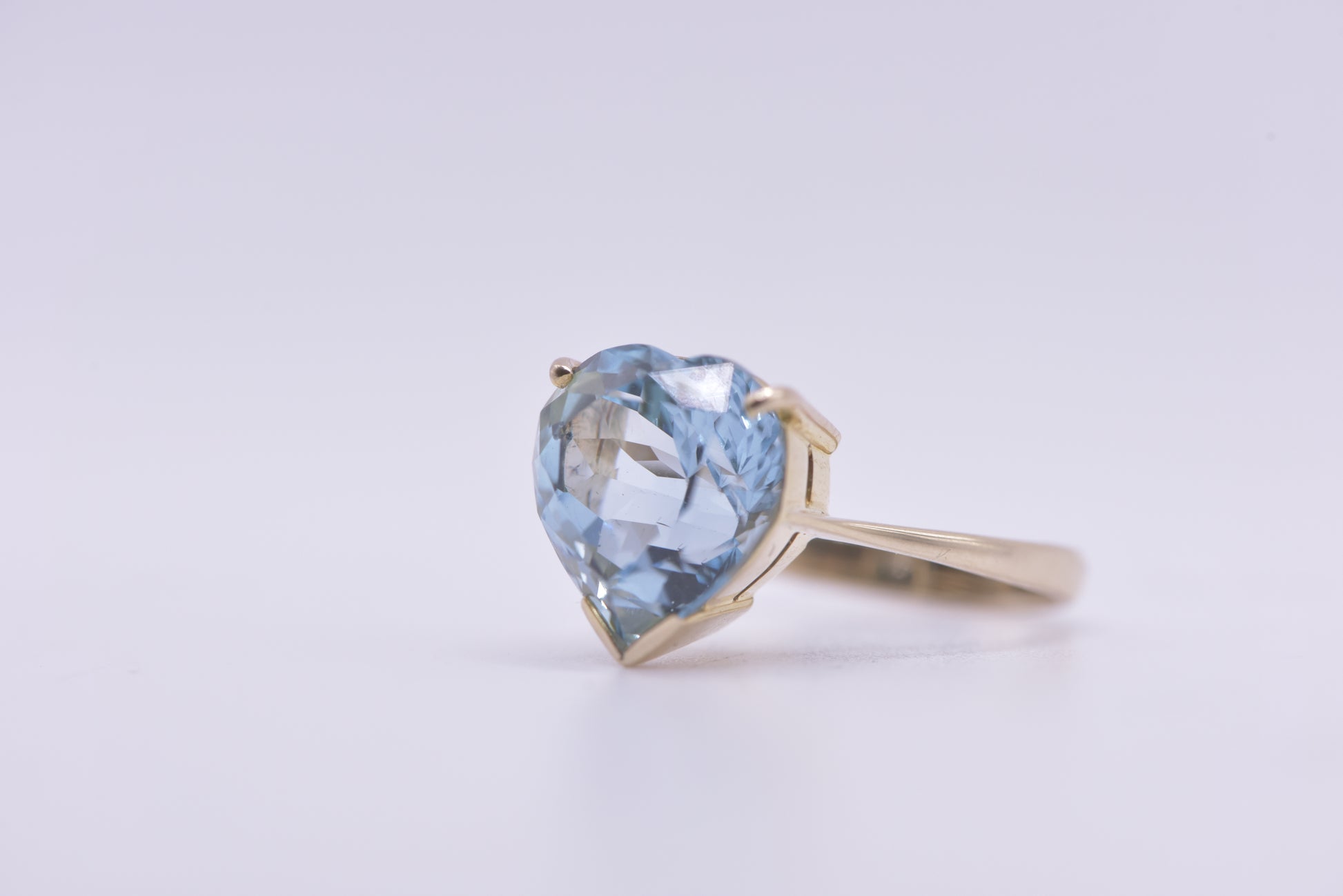 13ct yellow gold 'heart of the ocean' blue topaz ring. This stunning stone is set in 13 carat yellow gold (XRF tested) claw set in a classic setting which allows the stone to shine.